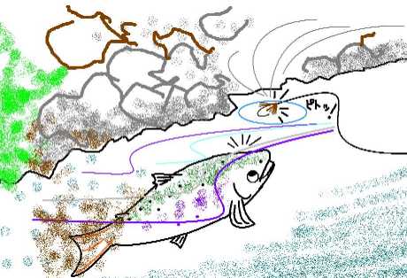 | さて、別の日の釣りです。 午前中はウエーデイングで体が冷え切った。 体力消耗でフラフラになって、 「ランチでもたべてエネルギーチャージしなきゃ」っと、移動。 稲荷寿司をほお張りながらプラプラと某Pを覗くと 「お、サカナだ」 まちょっとやりますか。 そこは対岸の岩盤に流れがぶつかり"ヨレ"が出来ているのですが、 その中に魚影が薄っすら見えています。 しかし、岩にカモフラージュされて正確にシルエットが把握できません。 それでも、そこそこ良型のようです。9寸はあるか、、、、。 ヨレの中で浮いたり沈んだり、上ったりさがったりレーンを外れたり 動いています。 ときおり定位して、たまーにライズをしています。 手前にやや筋を外してフライを流すと、SPもHTも見に来て止める。 「うーん、ま、普通だな、この反応は」、、フムフム(考え中)。 |