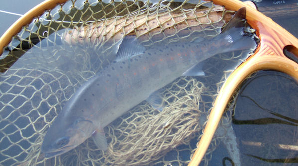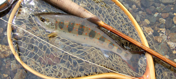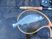 | みえるところだけで3匹ほどがクルーズライズしているがライズの間隔が 距離も時間も結構遠い。 流れも、フライも、ポジショニングも全くお初。 グラスの#4ロッドで目イッパイ。 結局、午前はひとつスッポ抜かしただけで終了。 クールダウンがてらコンビニへいって、チーカマかじりながら戻ってみると ドン開きで、3秒くらいかけて、ゆっくりH&Tしているのがいる。 完全にクチャクチャのクリップル系を喰っているんだな。 しかし、流速は秒速1cm、こりゃキビシイ。 ライズもスローモーションになるわけです。 結果、9寸ほどをやっと掛けたがばらしてしまい。 ようやく獲れたのは8寸のツマグロアマゴ、シラメのなごりがあります。 |
