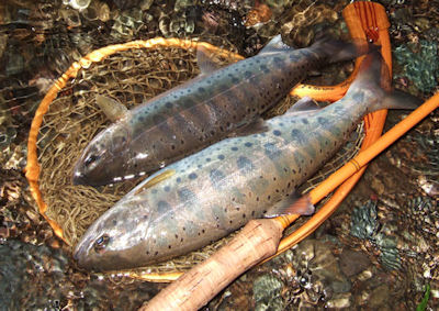 | イト氏をお呼びして同伴イブへ突入。 イト氏がニジマスをかけて、私が25ヤマメを釣って自慢をしていたら すかさずイト氏が泣き尺をかけて返り討ちにあってしまった。 痛い。 ほとんど間髪いれずの出来事だったので珍しい写真を撮った。 つまり私のを撮ってるとこに便乗して撮影したということ。 |