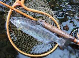 | HRの時間が近ずいてきたところで、ここ3回ほど探りイメージしてきた オリジナルフライにかえる。 視力が心もとなくなった私には視認性は決定的に重要なのであって その点は文句なし。あとはサカナ目線のカモフラージュが効くかというところ。 凄く、ドキドキします。 このあたりで始まるはずだがなあ、、お!随分手前でスーッと顔が出たライズ、 コークスクリューライズ。 これだな、、こいつだな、っとフライをグーンと手前に引いて、ロールキャスト気味に 上流にあおり、投射!! おおお、良く見えるぞお、、そのままドリフト、、さっきと同じようにシュパっとフライが消えた。 軽めのキリモミに戸惑いっていると、ドンドンと重くなってきて、グンッとテンションをかけると 突進した。 ギュンギュンギュン。 やや下りながらランディング。 |