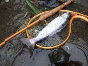 | さあて、釣りましょう。 虎の子ライズなれど、やはりスレスレ^^;。 しょうがないので、ポトリと落としたHTをクイッとひっぱり沈没させて、流下とともに ジワーっと沈下、、、、ヤマメの顔に近接近接、、、口に消えたフライをクイッと合わせると、 不意を衝かれ、ビックリしたヤマメは大暴れ、、、。ビユーン!! この位の魚は若々しくフレッシュで「青春しているぞ」、というエネルギーが伝わってきて 大好きです。 Pカンで出会えれば、もう大満足。 しかし、その後はダメダメです。 とにかく虫ッ気がなくほとほと困ります。 あっちこっち動きます。 |