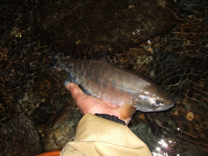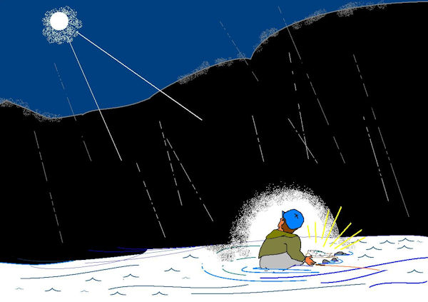 | 朝9時。減水、約20センチ。 したがって水没しての対峙。 スプークが恐くてレーンまでフライが届かないぞ!チキン! |