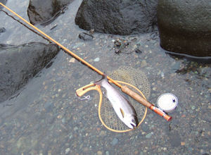 | 底石だらけの奥の流れでファイト!! 石に潜り込んだヤマメを2回ひきずりだして、きわどい展開でランデイング。 グッドコンデションのヤマメ。 |