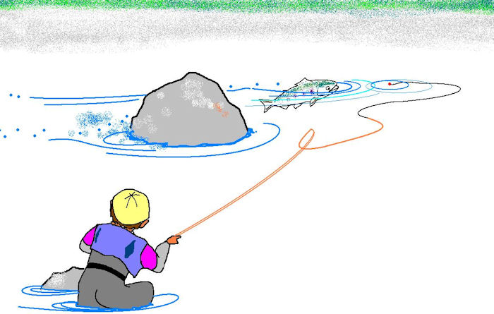 | ヒトツ、良いライズを見つけました。 はやりアップ気味のアプローチです。 大きくリーチをかけて、そのまま、そのまま、、、。 これを二回やったあと、ライズと同時に10センチ上流にフライが着水! クッ!近すぎか!? いや、出るかも、、、、、。 ヤマメの頭をそのまま流下するフライを見つけたヤマメはのけぞるように フライを咥えた。モクッ!! オウ!! ヒット! |