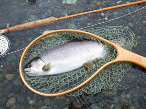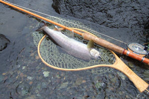 | さて別の日、この日は思い切り遅出で、すでに雨。 微妙な水色で、ちょっとマズイ。 数匹のライズに対し投射するも釣れず、移動しようと、 ラインをバーンと投げて、カリカリカリカリと巻いていたら プルプルっと釣れて来た。4寸。 雨がガンガン降ってきた。 まだろくに釣りをしてない。 濁りでの強制終了も時間の問題なので、あせって釣り上がりだしたわけで、、、 そしたらグワンと出た。@KSSS-Y |