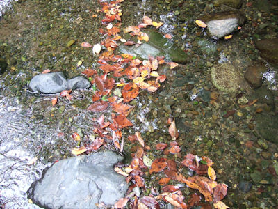 | 川の落ち葉は風情がありますねえ。 |