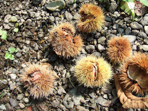 | 河原に落下した栗は、これは拾ってもいいのかしら? 法的にはどうか?衛生的にはどうか?木の所有者に「よこせ」と言われたら? などとシュミレーションなどして、考えたりします。 イガの中の綺麗な栗が欲しくって、いじってみたら棘が刺さって痛かった。 火中の栗でなくとも充分いたかった。 |