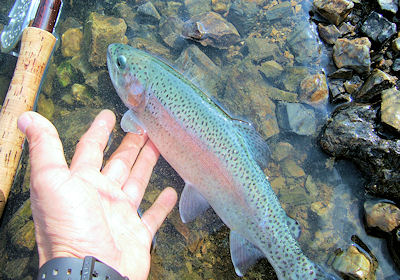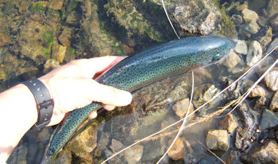 | そんな感じで、ぐるぐると散歩をしていくと、バシバシ釣ってる人を発見した。 いわゆる”加賀プロ”と呼ばれる釣り人なんでしょうか、確かに良いポイントに 陣取っています。(ここで釣れてる人の棚をチェック!!) 私もインジケのスタイルに変えて(私、このインジケがピコピコするの大好き) おじさんから、やや離れて釣り始めます。 タックルは#4のスコット9f、これでまあ充分遊べます。 #5でシンキングをちょっとやってみたけれど筋肉痛になりそうなんで直ぐ止めた。 |