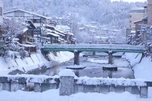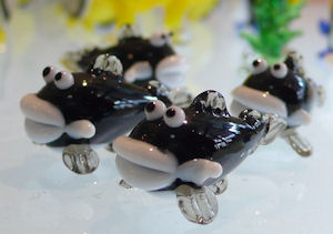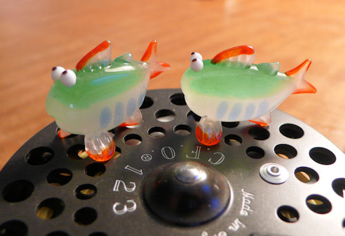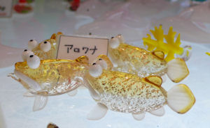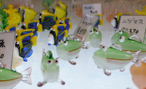 | しかたないので飛騨高山へくりだし、ソバの名店で天麩羅うどんをたべて 年越しソバを調達。 高山は古川より標高が高く、つまり日本海からの雪は海よりの古川までに ガッツリ降り落し、あまり降雪量はありません。 しかし寒く、路面は圧雪状態。 鍛冶橋から川を覗き込んで、 「あ〜、魚は居ないな〜、下のプールではライズは無いかな、、さすがに、、」 と少し寂しい気持ちで、橋のたもとの店をみたら、そこはガラス細工のお店。 花やら干支やらいろいろのガラス細工が販売されていて、う!魚がいるかな? と探したらいたいた!なんだか皆可愛くて、値段も手頃で、見れば見るほど 、一つ、一つ、と買ってしまいそう。 |