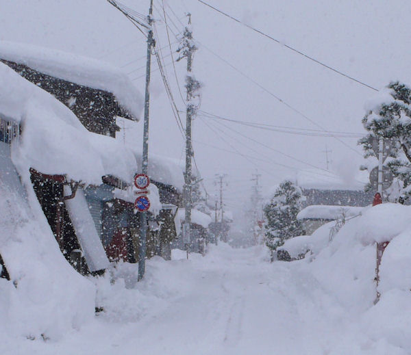 | ナマズが最高に素敵で、まるでウナギイヌみたいでした。 古川へ向かう道はこんなになっちゃってました。 このくらい屋根に雪が積もると、いわゆる”雪下ろし”をします。 事実、この道の奥のほうの家では、ご主人が屋根に登ってスコップで一生懸命 四角く切り取った雪のかたまりを下ろしてましたよ。 |