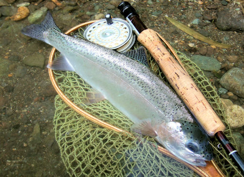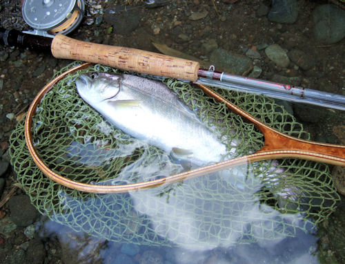 | 午後の部、どれだけキャストを続けたかなあ。 ちょっと遠投したフライが、チョブ、チョブっというライズの上にポトリ。 シュボ!クンクン! ギラクリ、ギラクリと魚体がキリモミしてるのが見える。 「あ!あ!ほ、本命だ;;;」 ファイト中、腰引けは当然だけれど、ティペットが体に巻きついて姿勢が変。 持ち上げたら、チョキの尾っぽが先に水面に上がってきた(シンクロナイズドスイミングみたく) やべやべ、と水中に戻したら、糸を解きながらグルグル、クルリンパッとパニックファイト!! ヤッベー!!;;;; 本命でっす。 |