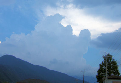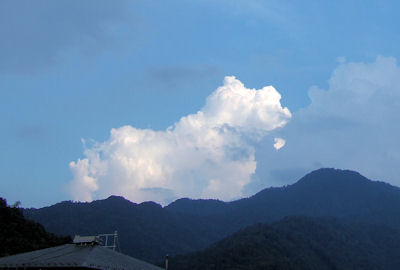 | まあしかし、暑いですね。 陽射しが全然弱まりません。 紫外線防御のため、化繊の長袖に、SPF50の日焼け止めを 顔全面に厚塗りします。 だから朝は顔は真っ白。 帽子を被り、偏光グラスをかけた,白塗りの変なオジさん。 車で移動中に並んだ隣のドライバーは物凄い驚いた顔をしたと同時に 顔をそむけ、二度と目線を合わせようとしません。 朝から、おかしなヒトに絡まれたらかなわん、という感じです。 昼前、こんな、ワン公みたいな雲が出来てました。 |