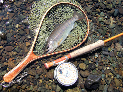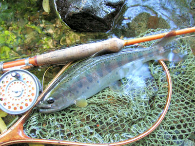 | 釣りには静の釣りと動の釣りがあるように思うのですが こんなときは動の釣りです。 どんどん、もがいて、動いて、歩いて行くしかないです。 この日も動の釣り。 対岸の良型をバラし、落胆しながらの次の一投目で、また掛かった!! 糸がふけて、ロッドのテンションないままだけど、ヤマメはなにかパニックって、 水の中を駆け巡っている。 あわててラインをたぐり、ようやく魚信を掴みますが、さきのバレが 効いていて、いつもより格段に腰がひけます。 |