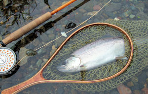| もう夕暮れで、フライも見えにくくなり、ああ、もうドイブに突入だし、 そろそろ終わりだな、完敗だな。と思った矢先にヒットしまして、 「おお、こりゃあ、凄いぞ!!5時間半の快挙だ!!すげえ、すっげ!」 と興奮の中、ひとしきりファイトして、最高の気分でランディングに入ろうとした 瞬間、プッツンと肉切れ!! 「ワオッ!!ワーッ!!」と心の底から叫んだのでした。 なかなか簡単にはいきません。 はい;;);; |