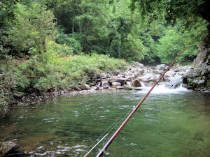 | 前出の川より若干、標高が低く、緑が濃い。 緑に囲まれた、やや鬱蒼とした感がありますが、アマゴの川です。 この時期、場荒れはいたしかたなく、こちらもスレ気味ですが、 ロングティペットリーダーで、出きるだけ遠くからのアプローチをし、 ゆっくりとした動作を心がけ、さらには竿抜けを見過ごさないで 釣り上がれば、程ほどに出てくれます。 |