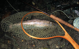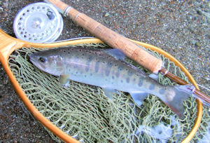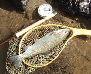 | 渋いライズなんで、ヤマメかと思ってドキドキしながら狙ってみたら レインボウ。 ニジマスもこんなライズをするように神経質になっちゃった。 そんなこんなで、プレイブに突入。 小さいヤマメを手掴みしてしまって、手を洗おうと水面に降りたら あっ!ライズだ。 |