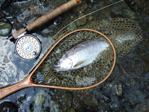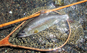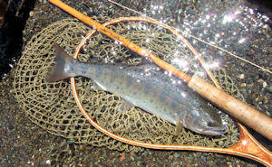 | 数日後、他のポイントFSで狙っていたヤツをやっとかけたら ばれた。 ちょっと見放されたな、、とウナダレながら探索したらますます ゲンナリモード。 ちょっと目先をかえて移動した。 そのステージではやはりライズはなく、途方に暮れて座り込み 10分ほどボーット眺めていたら、ボクッ! アッ、ライズだ。 AMSを流したら、無視された。 掛けたら絶対にばらさないぞっと入魂のBKKSを結び、投入。 一発で出た魚は下流に誘い、約20m下流で強烈ファイト、キリモミ 3回のランディングミスの後、漸くランデイング。 完全無欠のP尺です。 |