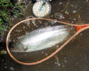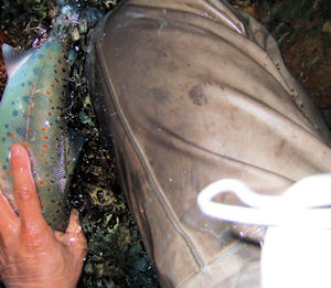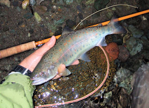 | 先々週、ヒップアクシデントがありまして、漸く復帰。 しかし、あくまでもリハビリで参ります。 そーっと歩きます。 川にも極力入らずに、ずっと眺めて居るだけです。 草が邪魔ですが、陸上でリーダーにティペットを接合して いき、フライを付けてタックル整備完了。 風が弱まってライズの存在を確認。 そーかー、ライズしているかあ、じゃあ、行くか。 と入水。 きく氏と電話をしているうちに頻発になり、、「じゃ、ちょっと狙ってみるわ」と きる。 魚影がみえる。つまりサイトが出来る。 えいっとライズの上に投げるとすっと上がってスッポヌケ。 下流から来るライズにゲスでフライ投入。 ちょっとよそ見をして、フライに目を戻すと、モクン! バシャバシャバシャ、、、おお、ヒット! 結構な走りを見せてくれる。トルクもある。突進もする。 疑惑の魚は、、あっパーマークが、、、。 |