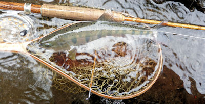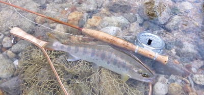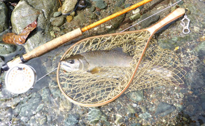 | 超散発ライズ、サイトでタイミングの釣り。 こうゆう場合、フライの落とし所が勝負の別れ目です。 3回目のキャストで入った、、三角頭がカポッ!ビーン!ゴボゴボッ、,,おお!! スリットに逃げる。開きに引きずり下ろしたいが、ストラクチャーの 領域にしがみ付く模様。 底石、溶岩、エゴ、、、、縦横に走りまくる。うわっうわっ-! 強引に近ずけ、ランディングネットを水中に浸すと 視界にそれと認識したヤマメはキリモミしながらエゴに猛突進!ヒーッ! 3度目の取り込みで、ランディング成功。 |