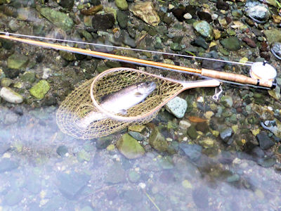 | こんな時のド散発ライズの対象は大抵あれです。 手持ちのもっともそれらしいフライをつけて完璧なタイミングと 完璧なコースで流してもせいぜいチラ見。 かーっ!これであかんかい!! もう無いよそんなフライ、、ぶつぶつ、、、とレインコートを着て 長い間ショボクレていたら、ややライズが頻発してきた。 あれ、何かハッチしだしたかな、、?? アッ! 久しぶりだなあ、お前さん(寒い小雨の日にハッチするあれです)。 もうこれしかないな。 フライを結び換え、本命筋に対し30センチ手前、20センチ手前と流し、 最後に10センチ手前にプレゼン。 2秒ドリフトしたところで魚影がグワンと揺らぎ、パクッ! キリキリキリっともがきながら流れに乗って筋から転がり出てきた。 ここも浅い流れ、そうなると走りまくる。右岸から左岸、斜め下流へ、、。 |