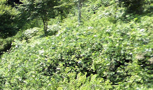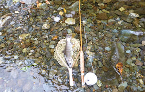 | 翌々日。 バンク際のシャープなライズ。 なかなかフライが筋に落とせない(ショートか、バンクの草に引っかかる)。 で、バンクから30センチ位の筋に漸く入り、20センチドリフトしたところで コッチに向かってバクリ! 尺ヤマメ。 |