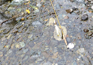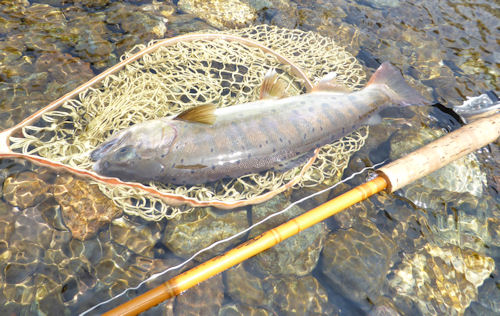 | 午後、ポイントを移動。 ヒラキのヤマメは渋すぎで、「あーあ、こりゃダメだなあ」と 流れ込みに眼をやると流速バリバリの中で浮いてる奴がいる。 左岸沿いににじり寄り、タイミングをじっと待って、えいやっ! 一投、、、バクっ!クリクリクリ〜。 コレマタ尺上の良い奴。 一日に二匹は久しぶりだ。 |