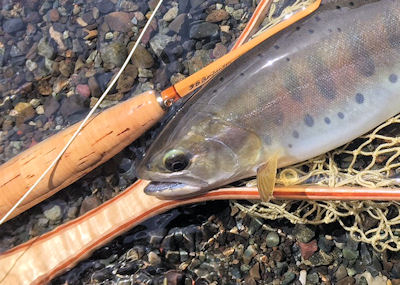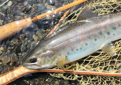| 今日も午前だけと出発。ニンフに限定した釣り、これも一興。 小さな魚がチラホラ、以前は良く釣れた荒瀬の中を攻めていたら 虹鱒のようなファイトをかますサカナがかかった。 背のステップを最下段のプール流れ込みまで引きずられランディング。 尺ヤマメ。 ニンフはこうゆう釣りが一番楽しい。 |