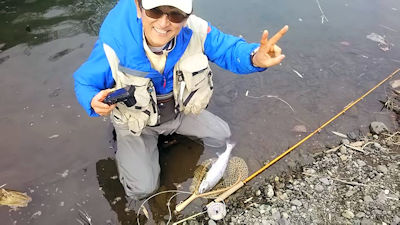 | 解禁日に何処に入るかというのは悩ましい楽しみであります。 今年もSKBの瀬に陣取っておりましたが、しょぼいライズしかなく サイズもいけません。 業を煮やして移動です。 TKSでは春のプールらしいライズと遊べましたが、ここもサイズがね〜。 サイズといえばアソコでしょう。 プールを覗くと魚影あり。 近接してみると確かにデカイ。 しかし私的には完全にニジと認識されるそれです。 で、ライト氏から着電があり合流。 まあ、あれ一応確認しとかなきゃとばかりにゲット。 ライト氏に撮影してもらう。 |