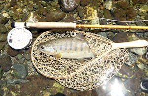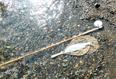| 別の日、虚心坦懐のマインドで参ります。 ポイントBBK。ここは友人は聖域といっております。 なぜかと言うと強烈にすれてるポイントだから。 そこにライズ発見。魚影も確認できる。ヨレヨレの水面を 縦横に移動しながらのライズ。どうやら新規のヤマメの模様。 約2時間の対峙の後ヒット! 20mを追っかけゲット。 |