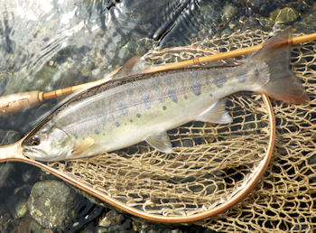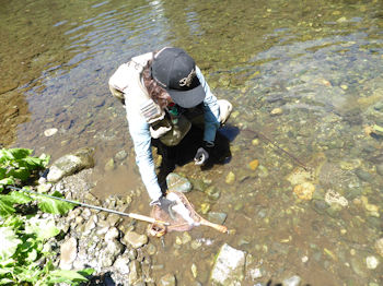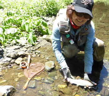 | 本日は先生と一緒に釣ります。 また今年もしっかり釣るんでしょうね(^^)。 朝6:00、「これから出かけます。現地で連絡を」 とメッセが入りる。おお、早い! 私としては珍しく早くに出発です。 現地に着いて車に同乗(自分の車がトラブルで代車で すのでなんかしっくりこない。 やっぱり荷室がでかいと便利なんだとしみじみ感じる。 いろいろ川を見てまわる。 某ポイント。 二匹浮いてる。 射程範囲の奴は泣きか、、。ちょっと遠投がいるのは尺はあるな。 泣きは頻繁にライズするが相当にフライに対し手慣れの模様。 とうとう反応させたがさすがにスプーク! うむむ、ちょっと場所変えしましょうかね。それともニンフに換えましょうか と場所を離れようとした矢先、遠目の尺が手前にやってきた。 「ねーさん、チョット待って、あれ、あれ行けるかもしれないから!」 そして数投。 バクッ! 「やったー!!」(ハモる)。 おおジャーンプ!!(結構強気です^^;;)。 |
