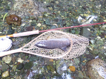 | さて、別の日。 薄ら暗い曇天の梅雨らしい一日。 雨に備え渡渉などは控えます。 水がどうゆうわけだか薄っすら濁ってきた。 ああ、もう今日はだめだな。ライズもどんどん散発になってきたし アイツ一尾だけがグルグルまわりながら時折ライズしている。 夏が進んでくるとライズもこうゆう風になってくる。 帰るに帰れず投げていたらタイミングが決まった!ヒット!! 梅雨の景色にぴったりの画像です。ドンテーン。 さて、さらに別の日。 今日は暑い。湿度も凄いし、そのくせ風が凄い。 体調が揺さぶられます。 水が少ない。渇水だ。 流れが激変して止水のようになってるポイントもある。 ヘンなところでライズしているのは小さいのばかりだが、水況の せいだろう物凄いスプーキーWWW。 ダレダレの釣りモード。 ウエーダーの中はグジュグジュ、顔はあせでベタベタ。 でも水を頻繁にグビグビ。 あー昼寝をしているようなボーットしている吐き出しのヤマメが 本当に時たま気まぐれに水面を弄っている。 葉っぱだったり、ちょっとデカメの塵だったりに噛み付いている。 でも、小さいナチュラルもたまにはマジで喰ってもいる。 あれ〜、あれ間違って釣れないかな。 でいつものフライをつけて投げたら物凄い嫌な顔をして逃げたWW。 ダア〜。だよなあ。 ヒゲとか付けたらダーってやってきてプイッっと踵をかえすW。 猫が毛糸玉と遊んでいるみたい。 むむ、どうしたもんじゃろなあ。 こりゃ無理だな。でも、ほかに当ても無いし、弄ってみるか。 せめて万一掛かった時の為にテイペットを太くしてフライもややでかくして 投げる。投げる投げる投げる。 結構な遠投なのでテペットトラブル回避のほうが重要と思われる。 おっ!良いタイミングで良いスポットに落ちた。 バクッ!!(^^V。 |