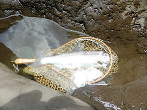 | こーんな所にいるんだからウブうぶだろうと定番フライを流すも無視! 逃げもしない。 うぶなことはウブだな。 タイミング、レーン、ステージ、フライ、いろいろ換えるがイマイチ反応が悪い。 これは例の新作フライの出番か!?? ということでちょっとデカイサイズなのでキッチリとティペットサイズを上げて タイミングを図って〜、ヒット〜(^^v。(FB的だなW) 作戦勝ちなのだ。 |