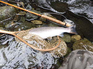| 例によってボーっとしたサカナを確認、ちょっと見えにくいが まあまあのサカナ。 こうゆうコンディションの大原則は一発で決めることですが、 解っていてもねえ、小さいのから試しちゃう。 で、流したら見向きもしない。 魚影が揺らいだら、むむむ、ちょっとデカイかも。 で、ティペット私としては極太のサイズにしてフライサイズも #16に。 逆U字でボトっ(**)。 |