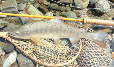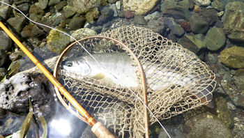| こんなP−カンでは厳しいし、さかなもスレにスレていて、こっちの体調と 合わせ、まったくインセンティブが出ない。 けど、狙うことは狙う。 釣れると否応無くファイトを強いられるので、ヒットするとイヤだなあと思いつつ それでも続行する。 いったい何をしたいのか解らなくなってくる(^^;;;。 それで、とっかえひっかえフライを交換するが、定番のフライは完全に見切り 逃げる、怖がる、嫌がる。 某フライ、これは15年前に巻いたっきりボックスに入ったマンマのフライだが ふと目に付き、一流ししてみると、ヤマメは鼻先をくっつけ確認しながらドラグギリギリまで ホバリングしながら後ずさりした。 ほほー!!これは喰うな(ニヤリ)。 ヤマメのやる気のサイクルをじっと見つめて、ぺロッと一舐めして、エイヤ! ヤマメの泳層にフライが漂って移動する。 気が付いたヤマメが右に5センチ顔を振り、戻した。 ヒットー! びっくらこいたヤマメは思い切り首を振って抵抗。グニャグニャグニャ! そんでもって水底に向かい突進し、手前のエゴに突っ込む突っ込む! 此方は腰をかばいながらファイトするが、おもいきりへっぴり腰になってしまう。 移動の時も腰を引くことが出来ないんですね。 |