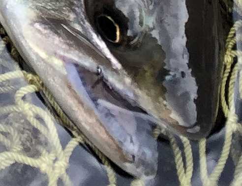 | それでもより大き目の方に狙いをつけて結局最小サイズのシステムでアップクロスで 大きく逆U字をかけてプレゼンしヒット! ファイトが凄い。浅いプールを追っかけながらランディングまで4回かかった! この川のレコード、31センチ。 |