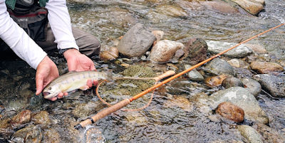 | 濃厚なエリアをあてがっていただき、釣上がります。 とある流れの肩、大きな定番フライを流したら浮上してきた。 おお、大きいぜ。 むむむ。 ということで定番チェンジです。 ちょっとだけ小さめの黒い奴を流したらスンナリと出てくれました。 |