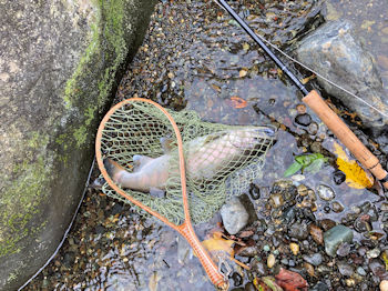 | ギリギリのゲットでした。 またミスです。助かりました。 夢中だとこれはしょうがないですね。 良い秋ヤマメです。 |