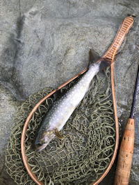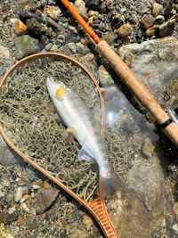 | 気をとりなおし、イブに賭けるべくプールに移動。 初めてのポイントなので勝手がわからない。 標準ヤマメ、イワナは釣れるが本命が出てくれない。 ハッチが目まぐるしく変わる。 かなり難しい。 で、とうとう掛けた! 手応え十分! 間違いなくデカい! ジャーンプ!!!!、、、、、。 |