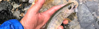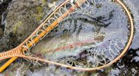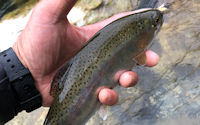 | マックロクロスケのブラックレインボウ。 サイズとコンデションでファイトは疑惑感アリアリだったが、一応写真を撮って 河原にひざをつく。。 雨が強くなってきて完全に気持ちの糸が切れ、後は惰性で投げまくる。 と、出た!フラットの流れ出しで出た。相変わらずのヘナチョコファイトで危なっかしいこと 甚だしいがなんとかランディング。 |