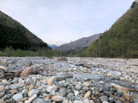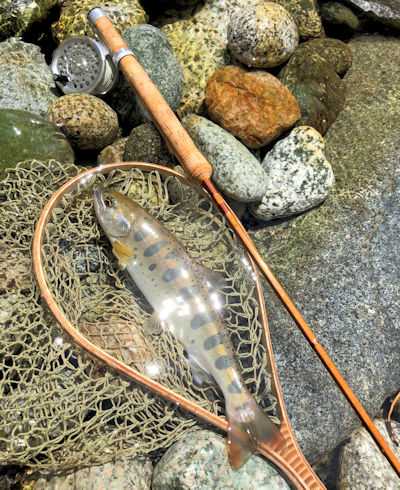 | が、水況が変化し移動を余儀なくされる。 支流でライズがあり遊ぶ。 完全にピーカンで持ってきた竹竿をとりだす。 すっ転びそうで怖いけどやる。 これで九寸位が撮れればいいけどな。 |