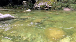 | そんなこんなで足を挫かないことだけを考え釣り上がった。 そして脱渓直前、これまた絶好のポイントが広がった。 の大岩前の溜まりから落ちていく流れ。 ドラグが掛からぬように丹念に刻みながらせめるT氏。 流石です。 |