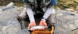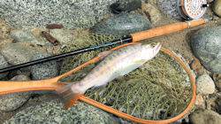 | シルエットがこんなですからサイズ以上のファイトを してくれました。 中型イワナ、ヤマメが出てくれました。 場所を上流域に移動します。 まだまだこちらは増水気味ですが逆に攻めるべきポイントは 限定されますので効率良いとも言えます。 |