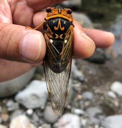 | 私は心折れて岸辺界隈の生物系をいじりだします。 生まれて初めてみるセミ。 アカエゾゼミです。 このデザイン。 本当に自然は凄いです。 |