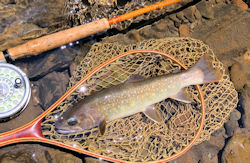 | イワナは現物はでかくていかつく猛々しいのだが画像に落とすと なにかしら可愛らしく道化て見えるから不思議だ。 これでも尺イワナである。 |