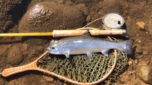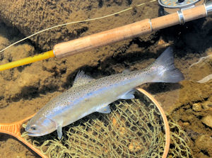 | それでもなんとか疎な区間に入り込み釣り始めてみる。 308では爆釣システムを打ち立てていたが、それが全く効かない。 どの魚も、フライに突進してきても直前で見切る。 うっかり咥えるのも居そうなものだが全員見切ってくれる。 痺れますな。 MKさんは「簡単に釣れるところは辛い」とおっしゃっていた。然り。 ここではツーハンドロッドを使っている釣り人もいる。常連さん達のようだ。 私は結局ハッチの始まった瞬間にちょこちょこっと釣ったのだが サイズもよく、綺麗なサクラ(下図)が多かった。オーナーさんの志が偲ばれる。 むかし結構ボロ鱒だらけだった上永野がこんなに綺麗な渓魚をストックするようになって ちょっと驚いた。 コテージもクラブハウスもポンドまわりの整備(芝生とか)も綺麗にリファインされていて 管釣りの理想形かもしれない。 管釣り文化(様式と嗜好)の熟成といえるかも。 それで平日でも激混みになっているのだなあ。 目先の売り上げを考えるよりこうした経営姿勢、いや経済というより釣りに対するポリシーを 大切にした方が結局、結果的には潤って来るものだということを目の当たりにした次第です。 いかに多くの成熟した釣り人は魚質を重視しているのがよく分かるというものです。 気の毒な魚たちを釣るとだんだん具合が悪くなって来ますもんね。 そんな釣り場、リピートしないでしょ。 どうしてそこんとこ気が付かないのか全く不思議なわけだ。 |