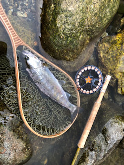 同一場所に居れる限界点を超え、後を彼に託し私は上流入渓点エリアに移動 (イブから這い上がるのにより有利であるためにと釣果より安全となってきた。老境に達してきたのだ)。 というのは嘘で、実は昨日、獲り残したライズがあった。エリアにある岩と岩の間に出来るシボレでのライズだ。 お目当ては他にもあったわけである。 |