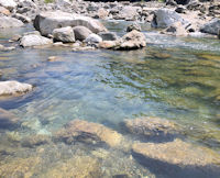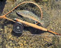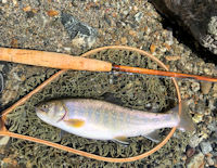 | 入渓点から釣り登るが、最初のポイントの肩で9寸がでた。 と、流れ込みの筋、Yパターン、底石の前、あらゆるところから 飛び出してくる。 |