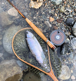 | ぐーんと通らずのプール流れ込み迄下がり釣り上がっても やはり釣れる。 時刻は16:30 もっとも有望な溜まりにやってきた。 ライズがある。 フラットな流れだが使い続けてきた#16クイルボディパラシュートを そのまま投げる。 普通はそれなりのフライに交換するが、釣りが雑になっている。 それでも銀毛ががったヤマメが釣れる。 で、流心の筋にちょっと大きめのフライでトレースしてみた。 もう充分釣れたし、イブまでしないで、 出来るだけ明るいうちに切り上げようと思った。 すると尾鰭を出しながらアタックしてきた魚がいる。 捕食し易いようにスラックを適度に入れてそのスポットを再度流したら 出た。 |