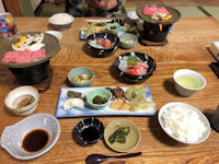 | 飛騨牛の陶板焼き、天麩羅、御造り、蕎麦、、、、。 本日は完璧だ♪ |