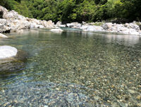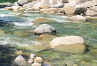 | 昔なら岩の上を飛んで歩いたものだが、すこし知恵がついたのと 身体特性が変化したことを自覚したために岩の間のスリットを這うように 移動するようになった。 それは良いのだが、この川、暴れ川でも名を馳せているように砂の埋まりや 小石が少ない。したがってスリットが極端に深く埋まっていないところがあり、 それに足をとられ股関節を痛めてしまった。 当然、沈没を併発する。 これで戦意喪失し、上陸する。 さらには暴風が吹き荒れだす。 お陰で全てが乾くのに1時間もかからなかったのは良いが、さらに戦意低下に 至る。 しょうがないのでポイント散策。 |